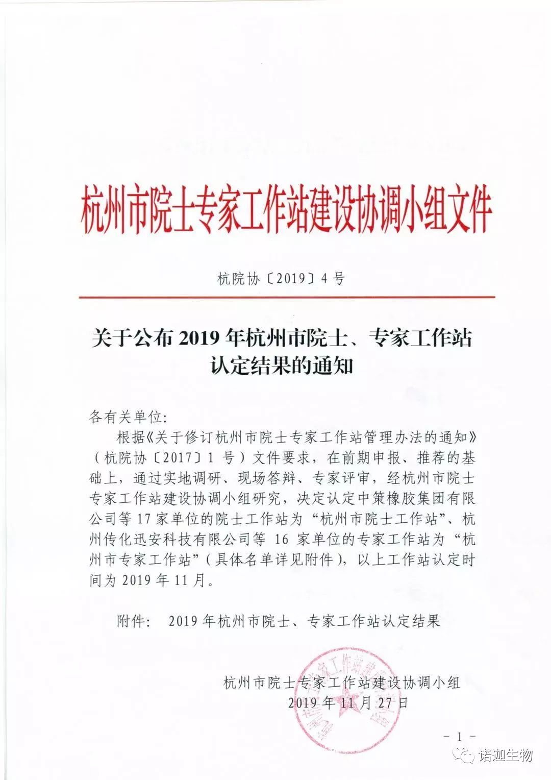 11月27日,浙江諾迦生物科技有限公司正式被認定為“杭州市院士工作站”。